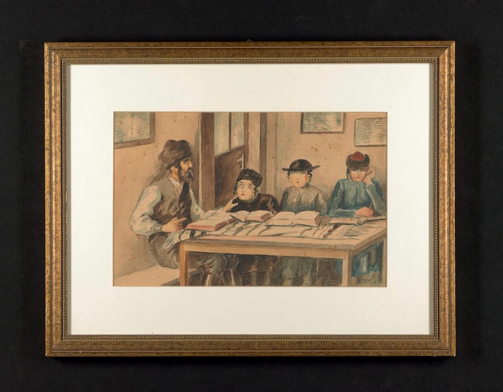 Gerahmtes Gemälde (Aquarell) : Darstellung eines Mannes mit drei Kindern an einem Tisch mit Büchern
